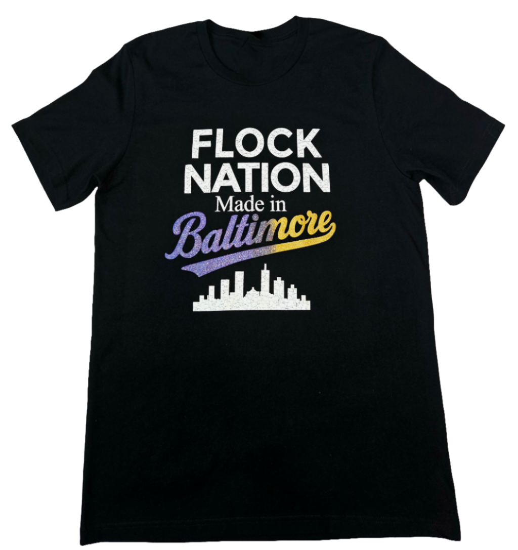 Born from the city, built for the culture. Featuring a shimmer print “Made in Baltimore” script and skyline graphic, this tee reps your roots with bold energy and street-ready flair. A staple for every Flock fan, no matter where you roam.